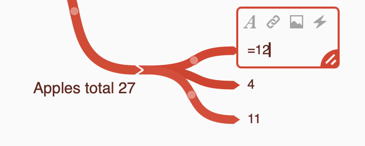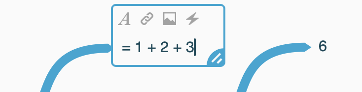 Calculations allow you to perform mathematical operations, such as adding up numbers in the branches of your Coggle diagrams. This uses a special syntax starting with = for each calculation: very similar to the way that formulae work in Microsoft excel spreadsheets.